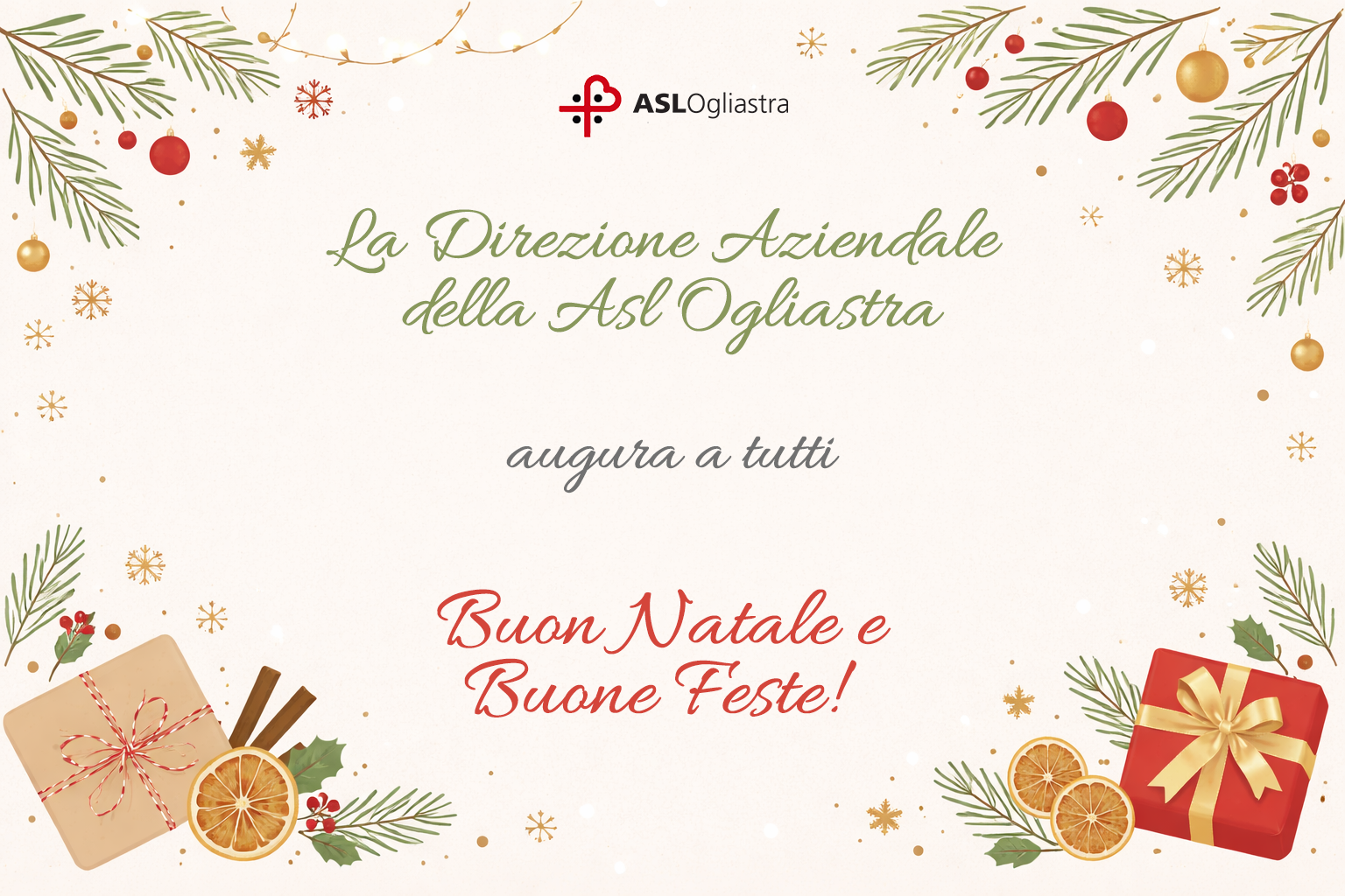 Lanusei, 22 dicembre 2025 – A nome della Asl Ogliastra, la Direzione aziendale porge ai cittadini ogliastrini, ai dipendenti della Asl n.4 e alle loro famiglie, i migliori auguri di buon Natale e di un felice 2026.
