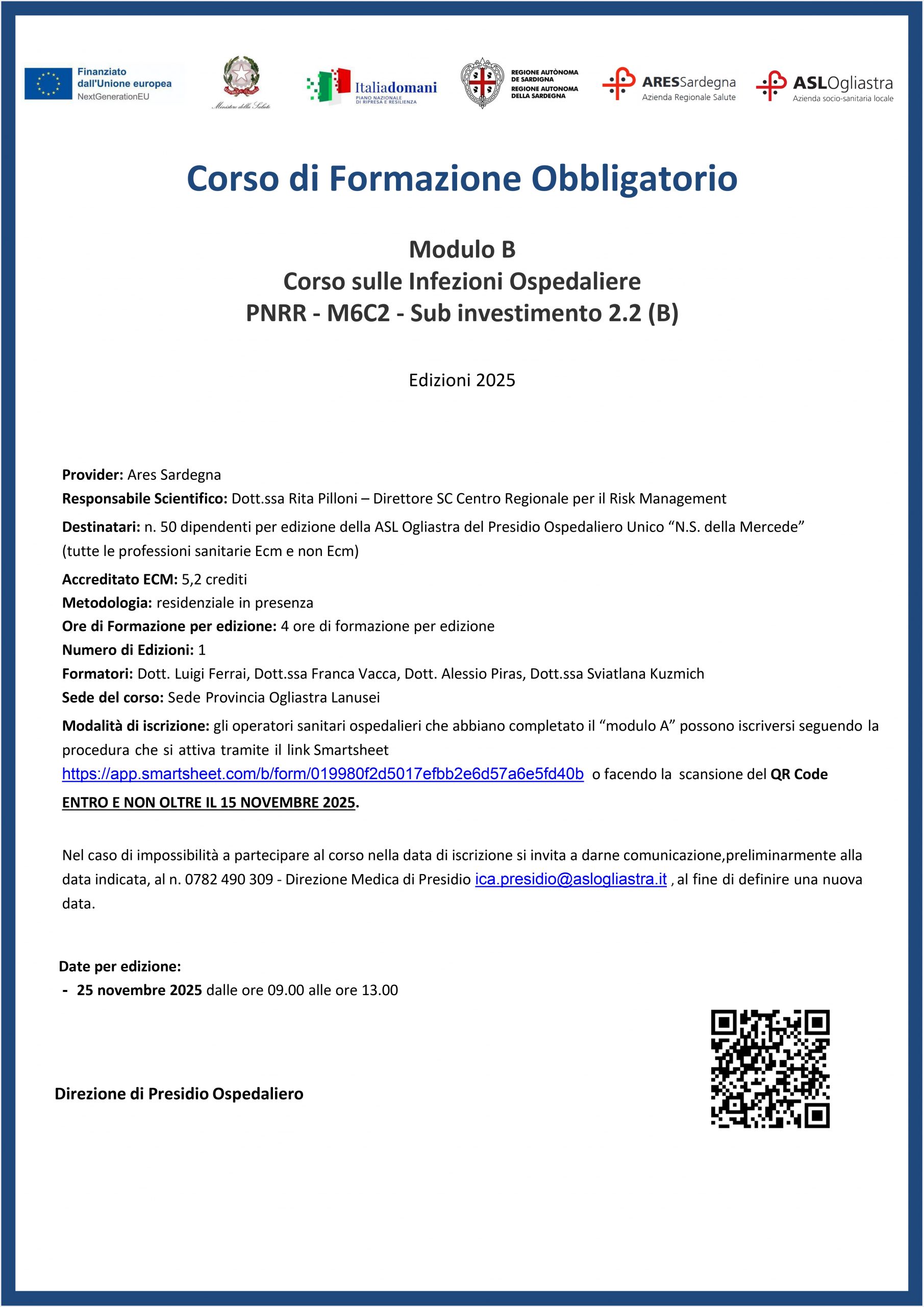 Lanusei, 14 novembre 2025 – Si comunica che, visto l’esaurimento dei posti disponibili per il Modulo B previsto il 25 novembre 2025, è stata calendarizzata una nuova sessione del corso: