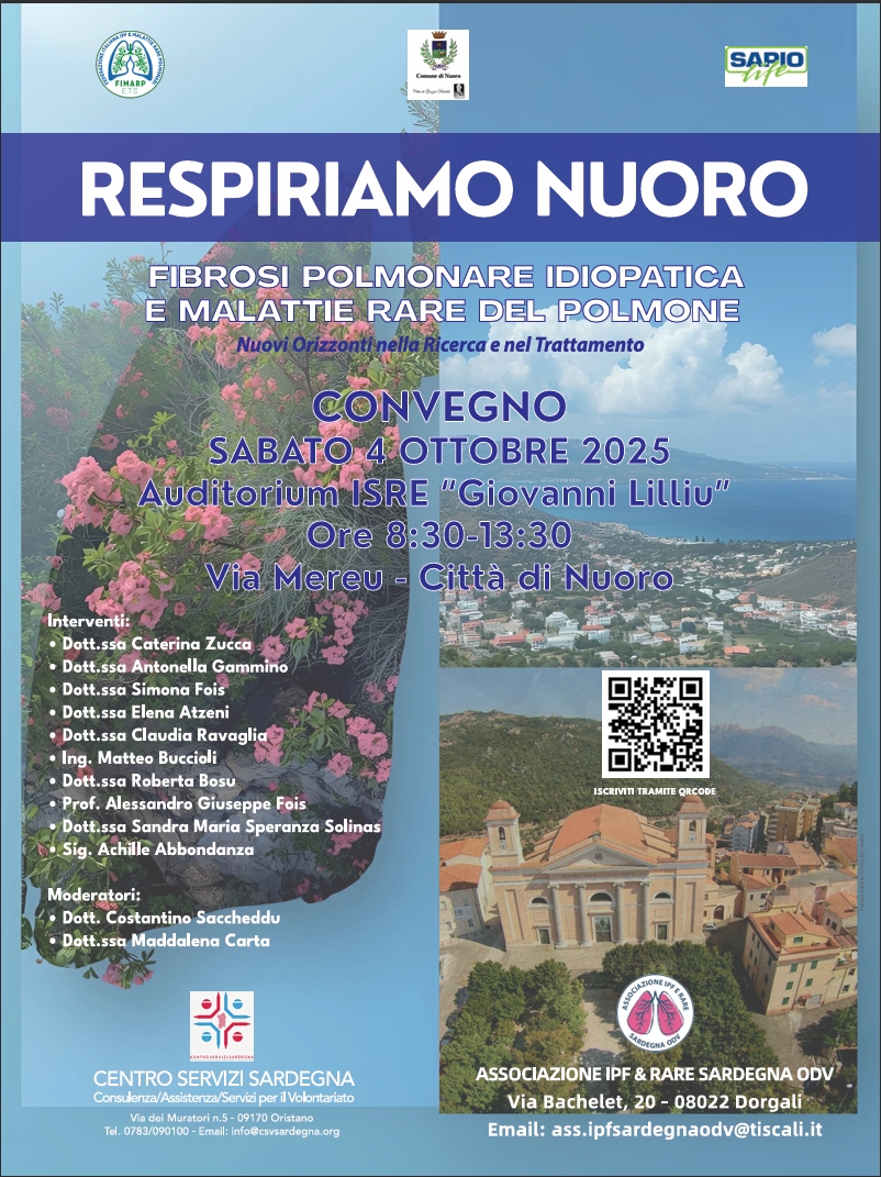 Lanusei, 22 ottobre 2025 – Si intitola “Respiriamo Nuoro” il convegno dedicato alle malattie rare del polmone, che si svolgerà il prossimo 4 ottobre 2025 presso “Auditorium Giovanni Lilliu” (sede Isree) del capoluogo barbaricino.